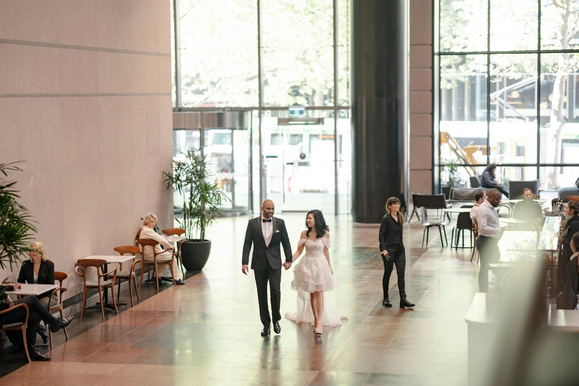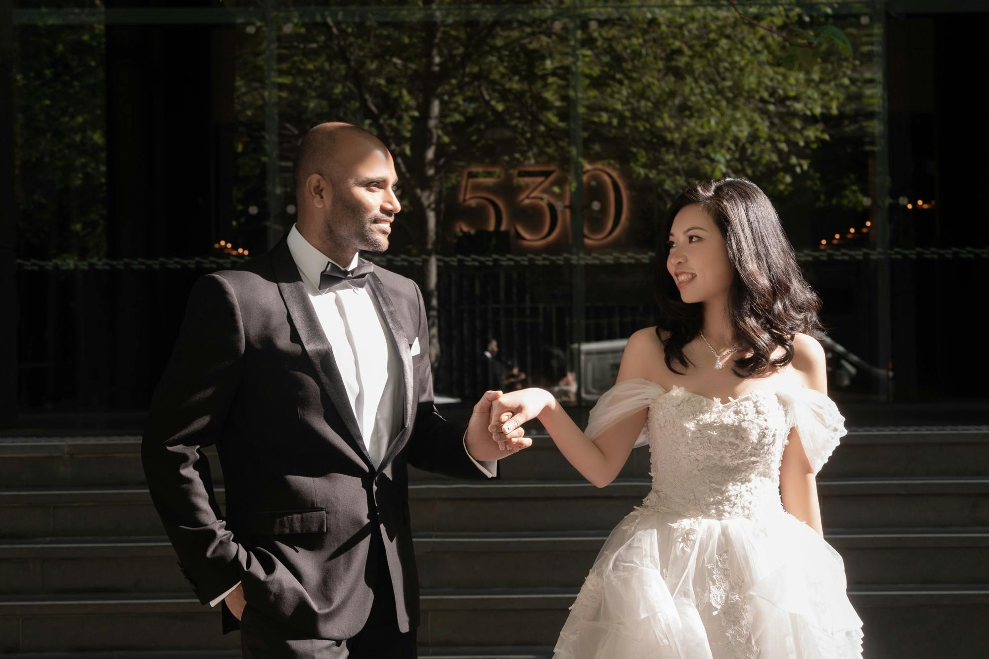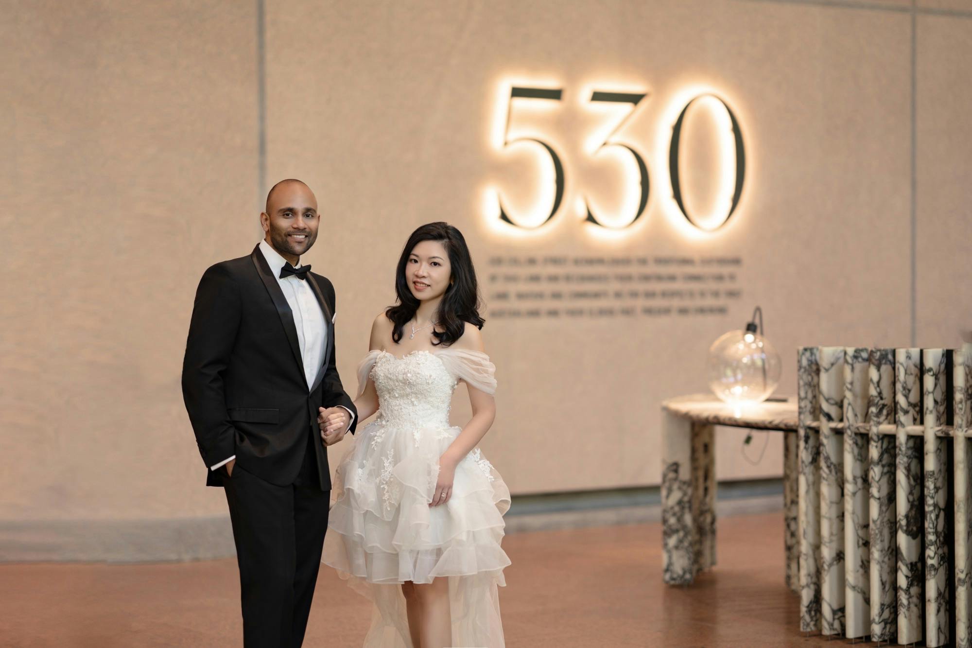 Alex and Sarah’s journey began as colleagues, but little did they know their shared workplace would set the scene for a lifetime of memories as their love story unfolded at 530 Collins. Recently, we had the joy of hosting them as they celebrated their love by stopping by to capture these enchanting wedding photos in our beautiful lobby.